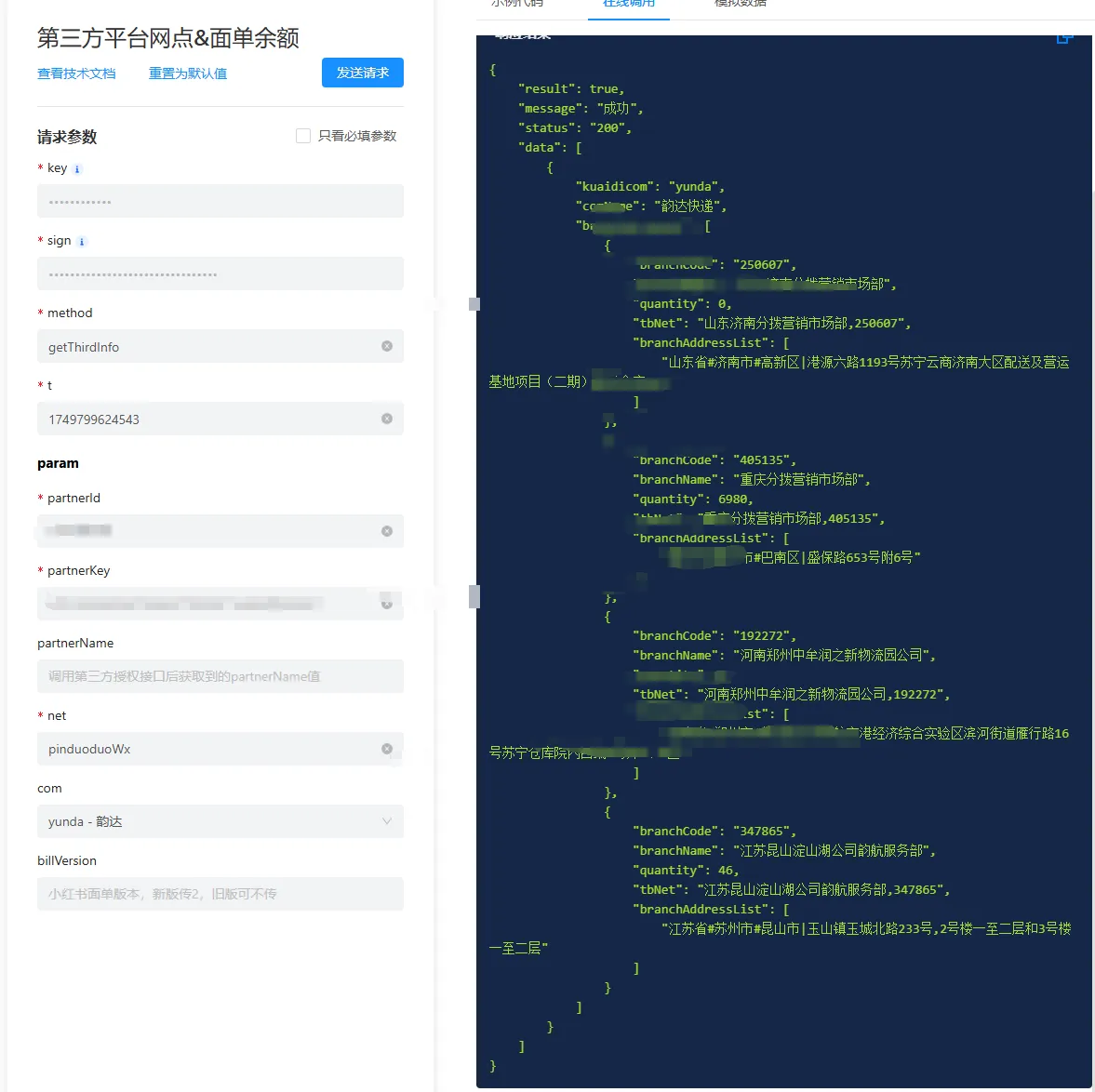 在下单前,可以使用第三方平台账号授权接口3—第三方平台网点&面单余额接口可以获取到该授权账户对应的绑定网点信息以及账户可用单量,如下图为各网点信息。如同一快递有申请多个发货地址,则下单时使用通过传入tbnet(按{"tbnet":"xxxx"}入参)来区分使用哪个网点下单。