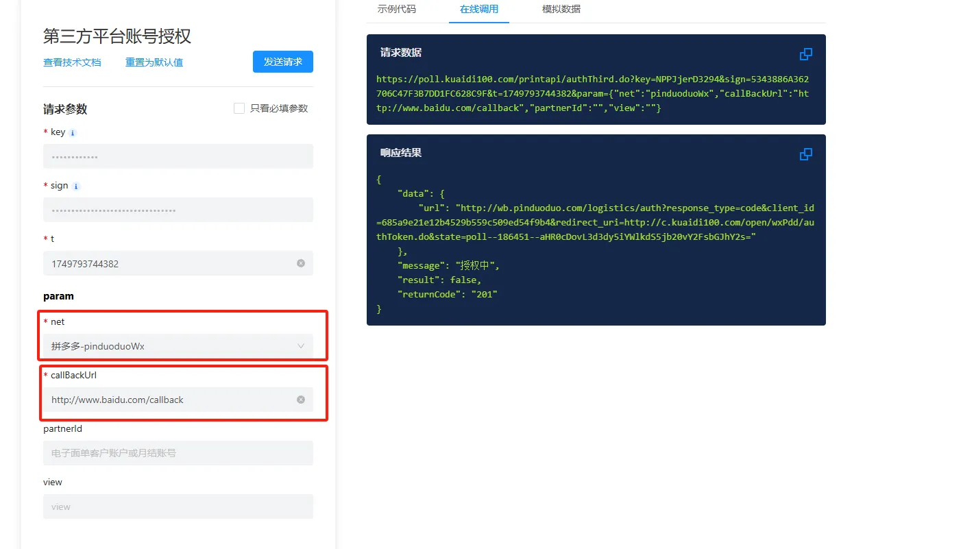 二、这里以调试工具授权为例,net选择拼多多,callBackUrl填入一个回调地址,点击发送请求后